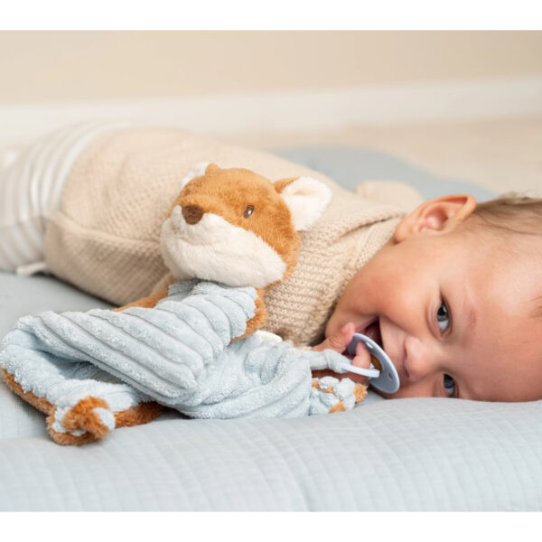 Το απαλό ύφασμά του διαθέτει χαριτωμένες λεπτομέρειες, όπως παιχνιδιάρικες ετικέτες, σχέδιο με τους φίλους του δάσους, και δύο κόμπους ιδανικούς για μικρά χεράκια.