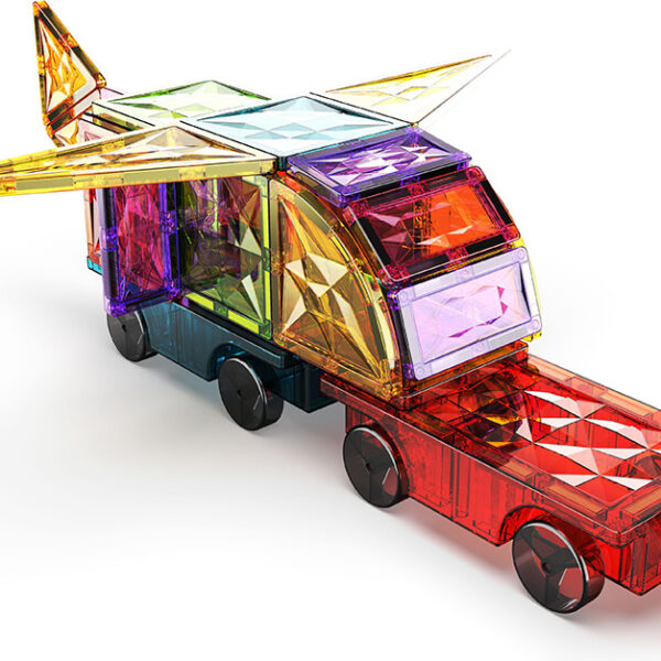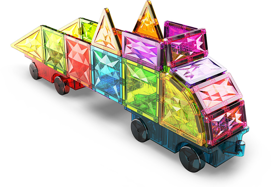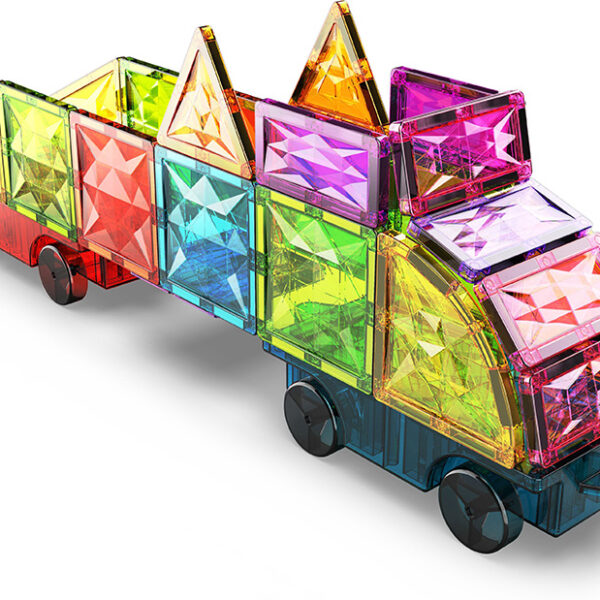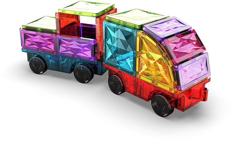 Το σετ περιλαμβάνει 2 μαγνητικές βάσεις τροχών με δυνατότητα σύνδεσης για να κινητοποιήσετε τις δημιουργίες σας. μπορείτε να κατασκευάσετε απλά μεμονωμένα οχήματα, να τα συνδέσετε και να τα συνδέσετε ή να τα ενώσετε μέσω του μαγνητισμού των πλακιδίων για να φτιάξετε ένα Geometric Express.